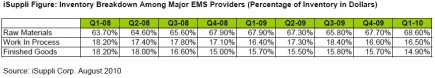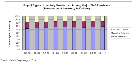 iSuppli指出,觀察全球前五大電子制造服務(wù)(EMS)的最新庫存狀況顯示,在2010年第一季,零組件與原材料占據(jù)近七成的總庫存量;相對(duì)來看,在制品(work-in-process goods)占據(jù)總庫存量的比例為17%,成品(finished goods)所占比例則低于15%。