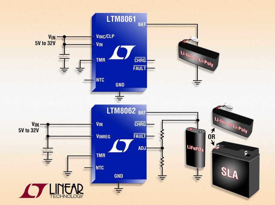 LTM8061特別適用于給鋰離子電池或鋰聚合物電池充電,并具有 4.1V、4.2V、8.2V 和 8.4V的浮動電壓。一個可在外部調節的浮動電壓使 LTM8062 能支持單節和多節鋰離子電池、鋰聚合物電池、磷酸鐵鋰電池 (LiFePO4) 和密封鉛酸 (SLA) 電池充電至 14.4V。