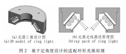 通過前面的分析可以看出,要想解決厚密板的光源照射問題,同時能夠保持精度的穩定與提升。必須基于厚密板的幾何和光學特征,有效地解決入射角度選擇以及適合應用對象的環形光源參數配置,基于此,本文提出基于定角度設計的適配環形光源,其基本原理如圖2所示。