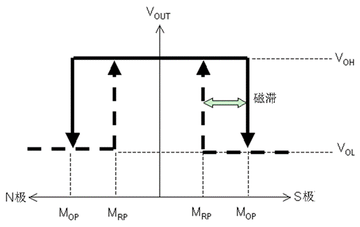 AS系列能夠通過(guò)磁鐵和傳感器之間的距離改變來(lái)檢測(cè)出磁通密度的變化,控制傳感器輸出信號(hào)的開(kāi)關(guān)(高(H)<=>低(L)),如圖5所示。當(dāng)磁鐵接近傳感器,使磁場(chǎng)的強(qiáng)度變大,則傳感器的輸出就會(huì)由“高”變“低”,反之則由“低”變“高”。