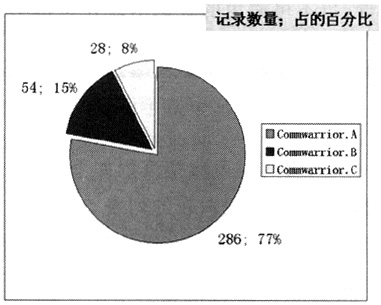 通過(guò)GPRS核心網(wǎng)抓包分析,目前用戶感染的彩信病毒類型主要是CommWarrior病毒,A,B,C分別是其的變種類型,具體感染的比例參見圖3。