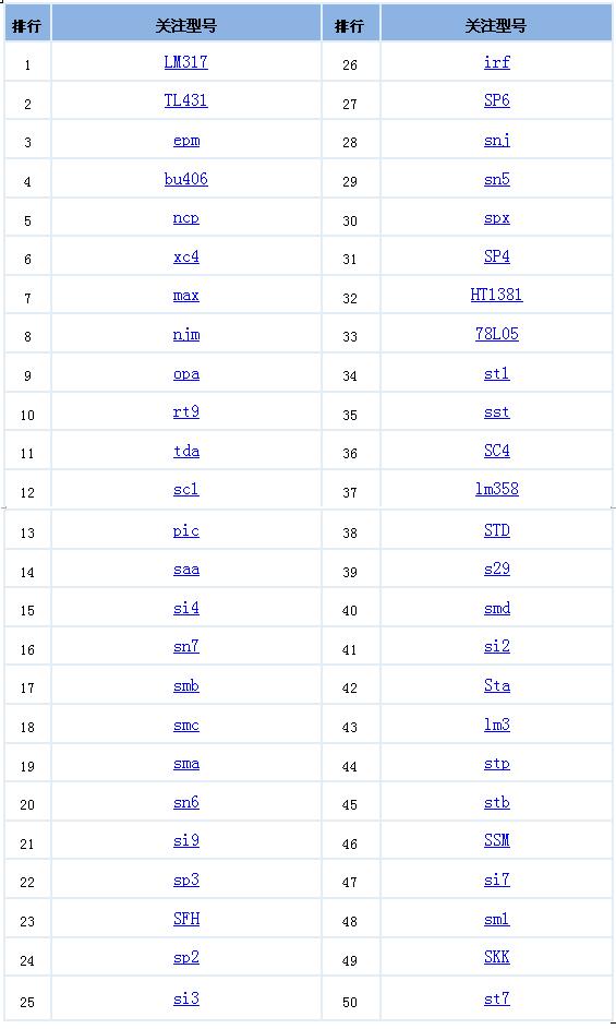 為客戶(hù)跑腿的除了快遞員,還可能是《華強(qiáng)電子》的小編!!!為了客戶(hù)跑遍華強(qiáng)北的小編你更是傷不起!從這個(gè)月起,商戶(hù)們記得要盯緊《華強(qiáng)電子》了,小編將定期不辭辛苦地掃蕩華強(qiáng)北市場(chǎng),嘔心瀝血為廣大商家整理出一周熱門(mén)搜索排行榜!哪些IC型號(hào)最搶手,哪些獲得最多的詢(xún)價(jià),前50名讓你一目了然!如果您口味比較獨(dú)特,前50名沒(méi)有讓你感興趣的型號(hào),盡管來(lái)電咨詢(xún),小編恭候您的電話。有更好的建議歡迎交流,求關(guān)注!求進(jìn)步!