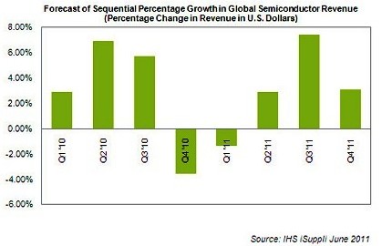 根據(jù)IHS的統(tǒng)計,日本共有14家半導體供應商與4家硅晶圓制造商受到地震沖擊。該機構預期,全球半導體營收將在第三季獲得加強力道,當季成長率可達7.4%,與日本廠商恢復全面生產(chǎn)相互呼應。全球半導體營收成 長率在第一季呈現(xiàn)1.4%的衰退,第二季則是成長2.9,預期第四季可成長3.1%。