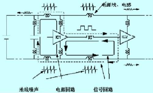 高速數字電路各類干擾的主要產生原因是由電源自身固有噪聲頻率及外部線路上各類變化的di/dt、du/dt 產生,由于電路板上存在電源回路、信號回路、高速信號回路及附屬在線路上的各類容性、感性負載,因此當信號產生跳變時都將產生一個尖峰沖擊形成噪聲,而這些噪聲將通過各回路的電流環沿路傳導,因此應當抑制電源自身的固有噪聲及各種高速數字跳變引起的噪聲。 抑制電路自身或者各類突變信號產生的噪聲,最好的抑制方式就是去耦和濾波。這樣既減少了自身的噪聲也能夠吸收外部對其的影響,提高自身的抗干擾能力。圖1 簡要說明在各個電路階段所產生的噪聲。