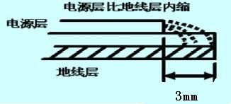 對于高速數字電路板應該采用多層板, 以減小環路面積, 將中間層作為電源或地層, 并且盡量保證電源與地相鄰的層間距盡量小;讓每一信號層都有一對應的地線層, 信號線與其地回路構成的環面積要盡可能小, 環面積越小, 對外的干擾越少。針對這一特點, 在地平面分割時, 要考慮到地平面與重要信號走線的分布, 防止由于地平面開槽等帶來的問題,信號線不能跨越地平面和電源平面分隔區, 防止形成大的地線回路。同時電源層應該比地線層內縮3 m m 左右的距離, 這樣將能夠抑制70% 以上的電源干擾。如圖2 所示。
