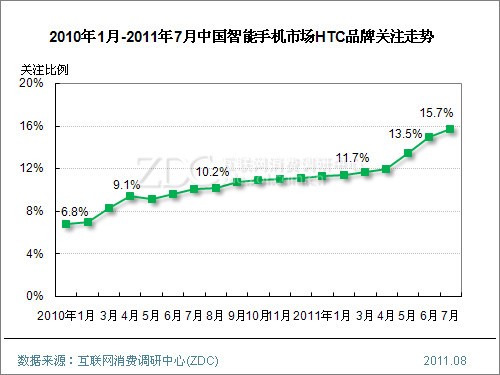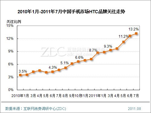 ZDC統計數據顯示,中國整體手機市場上,2010年1月至今,HTC品牌關注比例呈現出直線上升走勢,2010年1月僅為3.5%,如今已經達到13.2%,且在中國手機市場品牌排名中躋身前三甲。