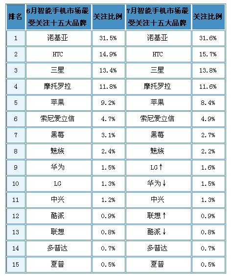 • 7月份諾基亞用戶關注比例為31.6%