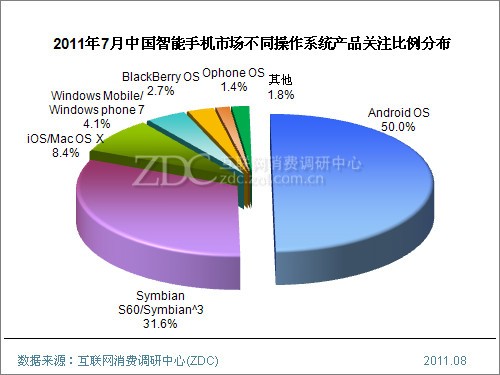 ZDC數據顯示,2011年7月中國智能手機市場上,在Android陣營主導品牌HTC、三星、摩托羅拉眾多產品價格下調的影響下,Android系統智能手機的用戶關注熱度再度上升,達到50.0%,獨占半壁江山。諾基亞Symbian S60/Symbian^3系統關注度則保持在三成左右。其他系統產品關注度均相對較低,在10%以下。