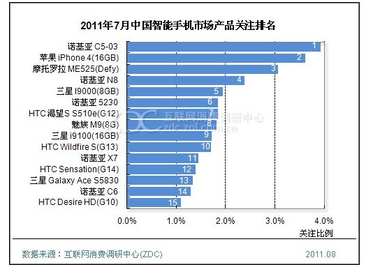 ZDC監測數據顯示,2011年7月,中國智能手機市場上,諾基亞的用戶關注比例為31.6%,仍然保持著冠軍地位,但優勢一直在縮小。排在第二位的HTC由于多款中高端機型暑期調整價格,用戶關注度攀升,7月達到15.7%,較上月增長0.8%。三星、摩托羅拉兩大品牌關注比例也分布在10%-15%之間,與HTC存在一定差距。