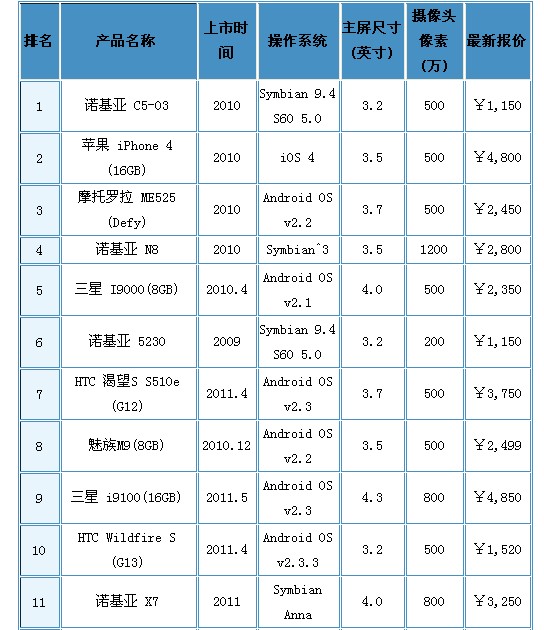 • 諾基亞C5-03領銜,蘋果、摩托羅拉產品緊跟