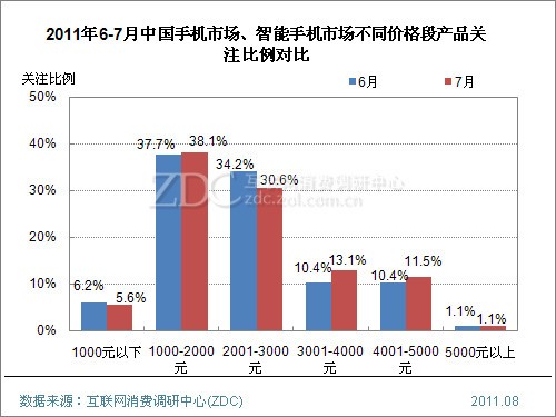 (圖) 2011年6-7月中國智能手機市場不同價格段產品關注比例對比
