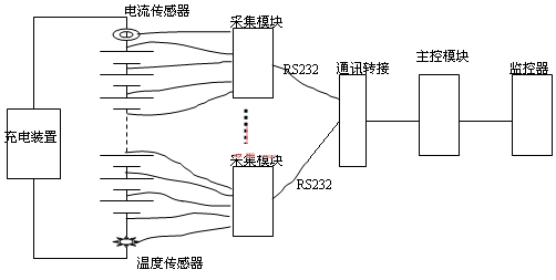 在電力系統變電站目前使用較多的蓄電池在線監測裝置是電池巡檢儀,電池巡檢儀又分為兩種,一種是測量蓄電池單體電壓的巡檢儀,結構是由一個主控模塊和數個采集模塊組成,主模塊接收監控器的命令,發送電池數據到直流設備的監控器;采集模塊中每個模塊采集10~20節電池的電壓、電流和溫度;通過直流充電設備的監控器可顯示各單節電池電壓,判斷故障電池的編號且給出報警。這類電池巡監儀一般由直流設備生產廠家提供,在訂貨直流設備時它是選配裝置,由于功能單一、不能測試容量、且測量精度差、容易誤報,限制了它的廣泛使用。測試示意圖如圖1: