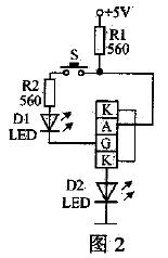 可控硅檢測電路如圖2所示,先用萬用表檢測出被測可控硅的A、G、K極,再將被測可控硅的A、G、K三個引腳插入對應的插孔中,接通電源,不按按鈕開關S時,發光二極管D2不發光,按一下按鈕開關S時,若發光二極管D2能持續發光,則被測可控硅是好的。