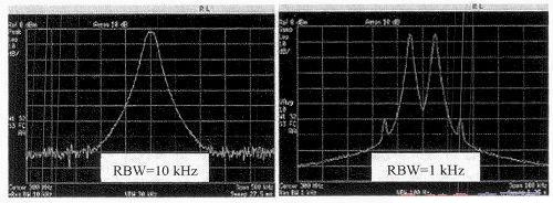 圖2是不同分辨率帶寬頻譜的顯示,可以看到分辨率帶寬RBW=10 kHz時不能辨別出載波形狀,分辨率帶寬RBW=1 kHz時可以清楚地辨別出載波形狀。
