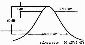 中頻濾波器的頻率選擇性是中頻濾波器的60 dB帶寬與3 dB帶寬之比,如圖3所示。它反映了頻譜儀分辨不等幅信號的能力,對于幅度相差60 dB的2個信號,其間隔至少是60 dB帶寬的一半,才可以分辨出2個信號,否則小信號可能被淹沒在大信號的裙邊中。用數(shù)字化技術(shù)實現(xiàn)的窄帶帶通濾波器頻率選擇性可達到5:1,模擬濾波器頻率選擇性可達到15:1或11:1。圖3為濾波器的頻率選擇性示意圖。