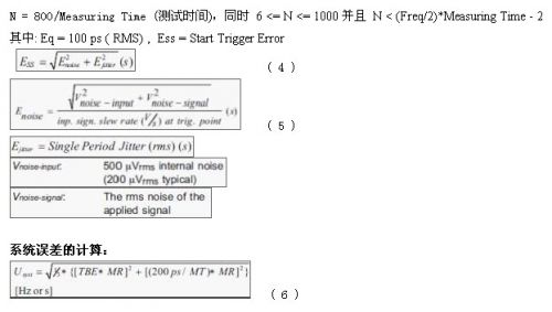在測試測量中測試精度一直是最為關(guān)心的問題。頻率計作為高精度的頻率和時間測試儀表,測試精度高于普通的頻譜儀和示波器,所以測試精度的計算就更加為人關(guān)注。影響測試精度,或者說產(chǎn)生誤差的因素很多,而其中最主要的因素是儀表內(nèi)部時基穩(wěn)定度、分辨率、觸發(fā)精度及內(nèi)部噪聲等。頻率計可以用來測試如頻率、周期、相位、脈沖等,而其中頻率和周期的測試占有絕大部分比例,本文主要討論頻率和周期的測試精度計算問題。