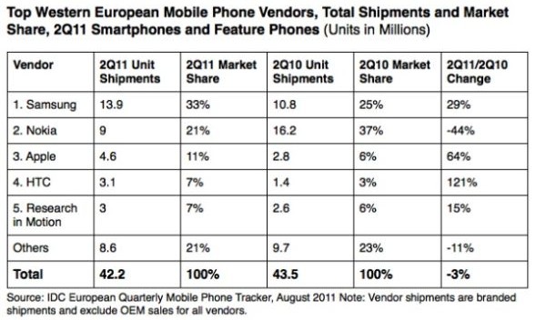 報告顯示,今年第二季度西歐地區移動產品出貨總量同比下降3%。IDC分析師弗朗西斯科·杰若尼莫(Francisco JerONimo)表示,歐洲嚴峻的經濟形勢以及諾基亞發貨量的直線下降是兩大主要原因。