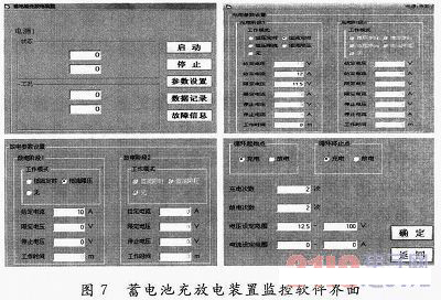 為了驗(yàn)證課題所設(shè)計(jì)的蓄電池充放電裝置的功能,設(shè)計(jì)了檢測與監(jiān)控系統(tǒng)。軟件的部分界面如圖7所示。