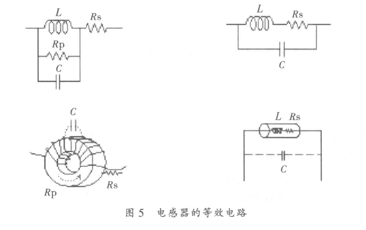 電感器由纏繞在磁芯上的導線構成, 其特性則由所使用的磁芯材料決定。空氣是構成電感器最簡單的磁性材料, 但為使電感器具有更高的電感量,經常用鐵、鐵氧體等磁性材料做磁芯。電感器的典型等效電路如圖5 (a) 所示, 圖中Rp 代表磁性的鐵耗, Rs 代表導線的銅耗, C 是繞線間的分布電容。對于低值電感應使用圖5 (b) 所示的等效電路。由于L 值很小, 繞組間的分布電容就成了主要的影響因素。