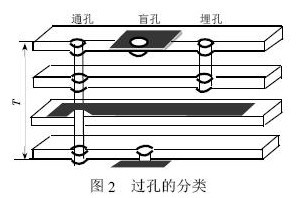 通孔,這種孔穿過整個線路板,可用于實現內部互連或作為元件的安裝定位孔。由于通孔在工藝上更易于實現,成本較低,所以一般印制電路板均使用通孔。過孔的分類如圖2 所示。