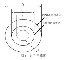 過孔是多層PCB 設計中的一個重要因素,一個過孔主要由三部分組成,一是孔;二是孔周圍的焊盤區;三是POWER 層隔離區。過孔的工藝過程是在過孔的孔壁圓柱面上用化學沉積的方法鍍上一層金屬,用以連通中間各層需要連通的銅箔,而過孔的上下兩面做成普通的焊盤形狀,可直接與上下兩面的線路相通,也可不連。過孔可以起到電氣連接,固定或定位器件的作用。過孔示意圖如圖1 所示。