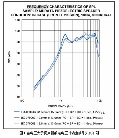 陶瓷揚聲器制造商通常規(guī)定了揚聲器的最大驅(qū)動電壓,典型值15VP-P。電壓最大時陶瓷器件的偏移量達(dá)到極限。外加電壓大于額定電壓時不會導(dǎo)致聲壓升高,反而增加了輸出信號的失真度。圖3為電壓最大時,陶瓷揚聲器輸出聲壓(SPL)與頻率的關(guān)系曲線。通過對比SPL與頻率的關(guān)系曲線圖以及阻抗與頻率的關(guān)系曲線圖,可以明顯看出壓電揚聲器產(chǎn)生高SPL時,在自激頻率處效率最高。