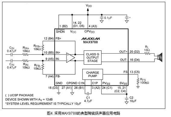 圖4中的MAX9788采用一個片上電荷泵產(chǎn)生與VDD相反的負(fù)電源電壓。當(dāng)輸出信號需要高壓驅(qū)動時,負(fù)電源電壓作用于輸出級。MAX9788提供了一種驅(qū)動陶瓷揚聲器的優(yōu)化方案,比采用AB類放大器和升壓轉(zhuǎn)換器的傳統(tǒng)方案更高效。