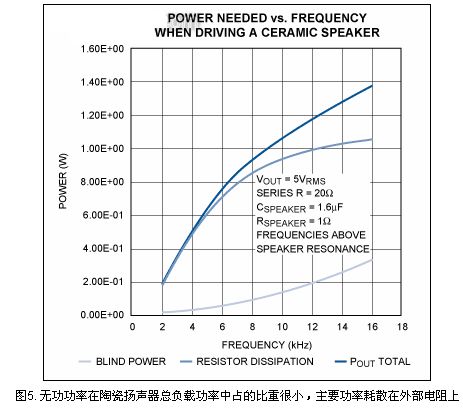驅(qū)動10Ω串聯(lián)電阻的陶瓷揚聲器時,總負(fù)載功率中無功功率占的比重并不大。大部分功率耗散在外部電阻上,圖5為放大器功率與頻率的關(guān)系曲線。