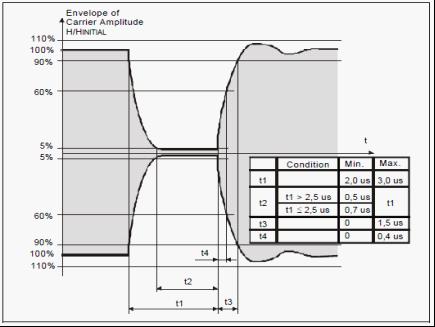 13.56MHz高頻RFID系統(tǒng)是目前國(guó)內(nèi)應(yīng)用最為廣泛,技術(shù)較為成熟的射頻識(shí)別系統(tǒng)。相關(guān)的國(guó)際標(biāo)準(zhǔn)對(duì)射頻發(fā)射頻率、信道帶寬、發(fā)射功率等參數(shù)都有明確的要求,特別是RF信號(hào)的幅度(功率)隨時(shí)間變化的情況,標(biāo)準(zhǔn)有著嚴(yán)格的規(guī)定。以讀寫設(shè)備為例,讀寫設(shè)備發(fā)出的載波信號(hào)的幅度變化時(shí)間,必須符合ISO18000-3標(biāo)準(zhǔn)對(duì)于t1-t4的時(shí)間限制。