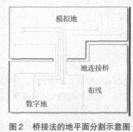 了解電流回流到地的路徑和方式是優化混合信號電路板設計的關鍵。如果必須對地線層進行分割,而且必須通過分割之間的間隙布線,可以先在被分割的地之間進行單點連接,形成兩個地之間的連接橋,然后通過該連接橋布線,如圖2 所示。