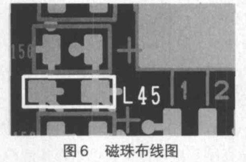 高速的A/D 混合器件在板上即器件外接的地引腳都接模擬地,電源引腳都接模擬電源,并且在電源引腳旁邊都添加去耦電容來消除高頻干擾,如圖5 所示。跨接電源或地的磁珠電感上的線要加粗,最好多連幾根信號線鉆孔接到電源或地平面,這樣可以減小了壓降,降低了噪聲,如圖6 所示。
