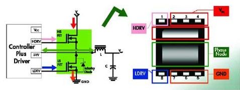 1.帶驅(qū)動(dòng)器和MOSFET的分立式解決方案現(xiàn)在仍在普遍使用。為滿(mǎn)足所有設(shè)計(jì)要求,現(xiàn)在飛兆半導(dǎo)體提供的采用小尺寸熱性能增強(qiáng)型MLP(QFN) 封裝的產(chǎn)品,可獲得高系統(tǒng)性能。MOSFET實(shí)現(xiàn)了首先采用MLP封裝(見(jiàn)圖3所示)。其Power56和Power33產(chǎn)品系列采用最新的PowerTrench技術(shù),能夠同時(shí)提供超低RDSon 和低Qg,從而適用于高開(kāi)關(guān)頻率應(yīng)用。鍵合技術(shù)可減小封裝的電感 ,提高封裝有限的ID ,適用于大電流應(yīng)用。其低端FET產(chǎn)品組合采用SyncFET集成了肖特基二極管 ,在實(shí)現(xiàn)高開(kāi)關(guān)性能的同時(shí)降低了熱耗。