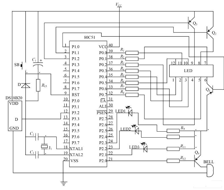包括信號采集、系統(tǒng)控制、數(shù)字顯示、高溫報警四個部分。傳感器DS18B20 為信號采集器件所采集到的溫度信號,通過內(nèi)部處理由傳感器的DQ 端送到單片機P3. 2 端口,經(jīng)單片機的計算處理后,由P0 口和P1 口分別作為4 位共陽數(shù)碼管的段控信號和位控信號,共同完成對所測溫度值的數(shù)字顯示,最高位是符號顯示,如顯示負號“-”時,表示當前溫度是負溫度,否則為正溫度;由P2. 0 端口控制蜂鳴器,當測量的溫度超過“預設(shè)報警溫度”時,發(fā)出提示音報警; P2. 1~ P2. 3 端口來控制黃、綠、紅3 個發(fā)光二極管分別表示低溫、正常、高溫三種溫度狀態(tài)。石英晶體JT 和電容C2 ,C3 共同組成晶振電路; 電容C1 、電阻R 13、S B 共同構(gòu)成復位電路; 其中電阻R13為下拉電阻,SB 為手動復位按鈕。