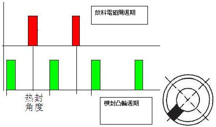 根據(jù)熱封的電子凸輪周期0~360設(shè)定促發(fā)開啟放料閥即可。比如,在開機(jī)前假設(shè)設(shè)定50度,放料。實(shí)際出現(xiàn)夾料。調(diào)整促發(fā)角度到150,直到合適為止。因?yàn)槁淞蠒r(shí)間足夠短,一個(gè)周期按120袋來(lái)算也有500ms。