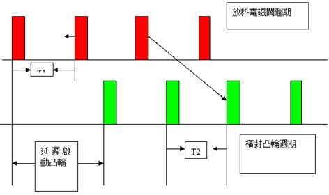 在打開第一個(gè)電磁閥間隔1s后打開第二個(gè)電磁閥。如此則在落料桶內(nèi)同時(shí)有兩包料,必須保證在后續(xù)的熱封電子凸輪運(yùn)行周期此完全吻合才能確保無(wú)誤,如圖5所示。