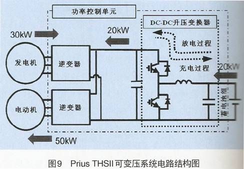 在THS中,蓄電池通過逆變器直接與電機和發電機相連(見圖8);而THSⅡ中,蓄電池組輸出的電壓首先通過DC—DC升壓變換器進行升壓操作,然后再與逆變器相連,因此逆變器的直流母線電壓從原THS的220V提升為現在的500V。