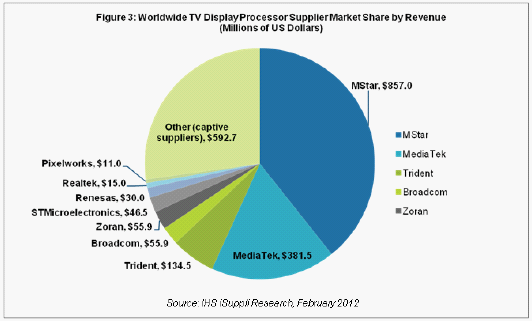 據IHS iSuppli公司的顯示電子專題報告,憑借與中國大陸廠商的緊密關系和清晰的產品策略,臺灣半導體芯片供應商晨星與聯發科2011年幾乎完全統治了電視視頻處理器市場,而包括英特爾在內的幾家廠商則認負出局。