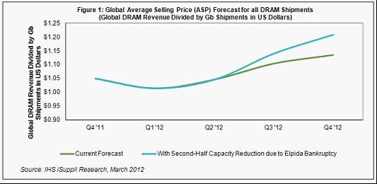 如果爾必達的產能減少逾25%,則到2012年底,所有DRAM出貨量的全球平均銷售價格(ASP)預計上升到1.21美元,比上半年末的1.05美元上漲15.5%,如圖1所示。如果不是破產導致產能大減,今年底價格將上升到1.13美元,只比上半年末的水平高出8.5%。