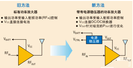 CDMA和WCDMA采用的調制電路導致了一種表現為非常數振幅包絡的調幅信號的產生。為了保持信號的完整性以及促進頻譜再生,需要一種線性功率放大器。然而,由于功率放大器只有運行在增益壓縮條件下才能保持較高的效率,因而轉換效率并不高。為了達到所需要的線性,實際發射功率從功率放大器的壓縮點開始補償,這導致了效率的整體降低。當手機以發射模式工作時,由于功率放大器實際效率低,射頻部分的功耗將占功率總預算的65%。