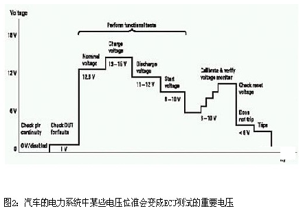 依汽車的操作狀態而定,在汽車的電力系統中常會碰到某些電壓位準。這些位準會變成ECU測試的重要電壓,如圖2所示。在這些重要電壓下執行的一些相關測試包括: