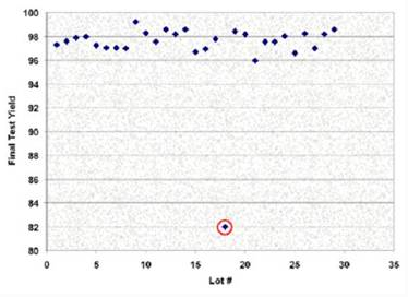 圖4最終測試良率(超負載試驗前)和標出不符合統計良率限值的點的示例圖。該點是一個異常值,是要求進一步篩選和分析的風險點,也可能會出現不合格品?! ?/p>