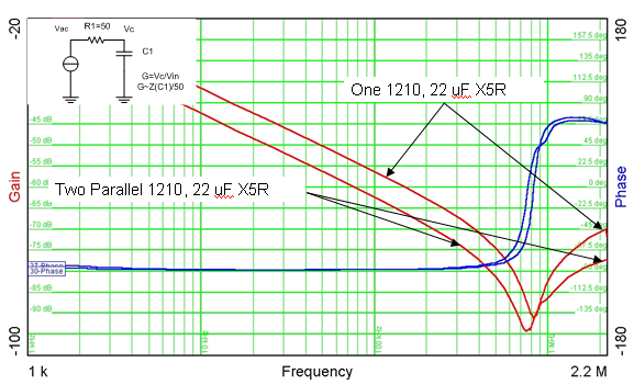 此外,還有一個(gè)與旁路電容有關(guān)的串聯(lián)電感,如圖 1 所示。頂部的曲線是貼裝在四層電路板上的一個(gè)22 uF、X5R、16V、1210 陶瓷電容的阻抗。正如我們所期望的那樣(100 kHz 以下),阻抗隨著頻率的增加而下降。然而,在800 kHz時(shí)有一個(gè)串聯(lián)電感,此時(shí)電容會(huì)變得有電感性。該電感(其可以從電容值和諧振頻率計(jì)算得出)為 1.7 nH,其大大高于我們 0.3 nH 的目標(biāo)值。幸運(yùn)的是,您可以使用并聯(lián)電容以降低有效的 ESL。圖 1 底部的曲線為兩個(gè)并聯(lián)電容的阻抗。有趣的是諧振變得稍微低了一些,這表明有效電感并不是絕對(duì)的一半。基于諧振頻率,就兩個(gè)并聯(lián)的電容而言,新電感則為 1.0 nH 或ESL 下降 40%,而非下降 50%。這一結(jié)果可以歸結(jié)為兩個(gè)原因:互連電感和兩個(gè)電容之間的互感。