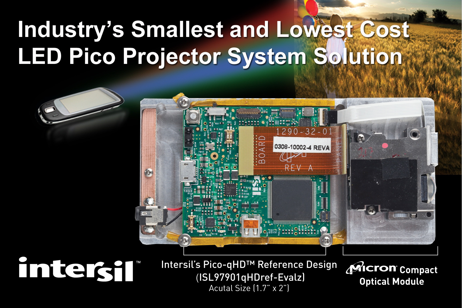 Intersil Pico-qHD™ 為低功耗和成本敏感型嵌入式或配套微型投影儀應(yīng)用而開發(fā),提供了完全集成的參考設(shè)計,其中包括高量生產(chǎn)的光引擎、硬件、固件和可定制設(shè)計文件。該低成本的系統(tǒng)解決方案,采用美光(Micron)公司的 E330 緊湊型 5.5 立方厘米 qHD 光引擎,可以輕松集成到廣泛的應(yīng)用,包括美光最近推出的便攜式PoP Video™微型投影儀移動設(shè)備配件。Pico-qHD™ 建立在緊湊、便宜的 1.7×2 英寸印刷電路板,可滿足如消費(fèi)類等應(yīng)用的低制造成本要求,如數(shù)碼相機(jī)、移動電話、平板電腦、視頻播放器和其他手持產(chǎn)品。受這些應(yīng)用的推動,太平洋媒體協(xié)會(Pacific Media Associates)預(yù)測微型投影儀的年銷售量將在2015年達(dá)到5800萬件。