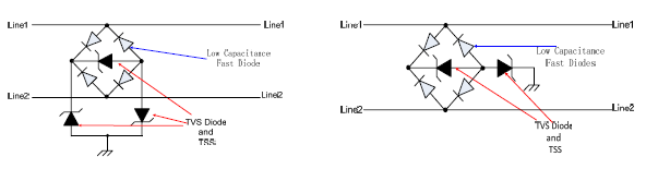 • 在較高數據傳輸頻率上,盡量采用低電容系列的產品B6A、B8C、SAC、LCE或通過二極管作降容處理,參考如示意圖2001 ABD、ISO7637 汽車電子等標準