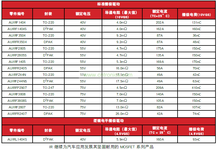 這些堅(jiān)固的新型平面式 MOSFET 采用 IR的成熟技術(shù),在線性模式運(yùn)行方面提供良好的性能。寬電壓范圍也使得它們適合應(yīng)用在卡車等使用較高板載電壓的車輛。