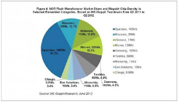 根據(jù)IHS iSuppli公司在三個(gè)季度內(nèi)拆解分析的55個(gè)嵌入產(chǎn)品,這些產(chǎn)品中有三分之一以上的NOR芯片屬于美國(guó)Spansion Inc.,在所有供應(yīng)商中處于領(lǐng)先地位,如圖所示。Spansion,以及韓國(guó)三星電子和美國(guó)美光,提供的NOR芯片平均密度為數(shù)百M(fèi)b。從2011年第三季度到今年第二季度,這三家公司占上述三個(gè)子領(lǐng)域中NOR芯片的53.4%。剩下的46.6%市場(chǎng)份額屬于生產(chǎn)100Mb以下密度NOR閃存的廠(chǎng)商。這類(lèi)廠(chǎng)商包括臺(tái)灣旺宏電子和華邦電子等大型廠(chǎng)商,以及臺(tái)灣常憶科技和宜揚(yáng)科技等規(guī)模較小的廠(chǎng)商。