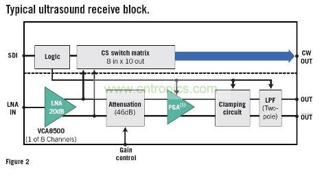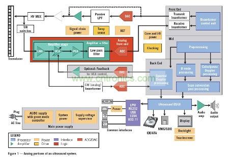首先以超聲波設(shè)備為例來探討模擬性能需求。通過該范例,本文將介紹如何在性能、功耗、尺寸以及集成度之間進(jìn)行權(quán)衡,并檢測雙極性與CMOS工藝技術(shù)的適用性。圖1是典型超聲波機器的系統(tǒng)方框圖,展示了傳輸與接收兩個部分。這兩個部分負(fù)責(zé)驅(qū)動傳感器與數(shù)字處理部分(未顯示),從而構(gòu)成完整的超聲波設(shè)備。