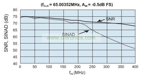 圖1:MAX12559在96MHz時(shí)鐘頻率、-1dBFS輸入時(shí),SNR和SINAD與輸入頻率的對(duì)應(yīng)關(guān)系曲線。