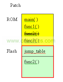 在上圖中,黃色區域是IC的ROM,這部份的程序是IC制作出來即不可以改變。綠色部份是flash。在圖中,flash分成2區,一個是jump_table,存放func1~func3的地址。剩余的空間FUNC_PATCH,預留給patch使用。