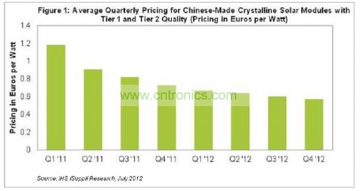 預計下半年晶體太陽能模組的平均市場價格仍將下跌11%,但跌幅略小于上半年的12%,并遠小于2011年下半年的20%。預計2012年第四季度平均市場價格將從第二季度的每瓦0.64歐元跌至0.57歐元。模組通常以歐元計價,而硅則以美元計價。